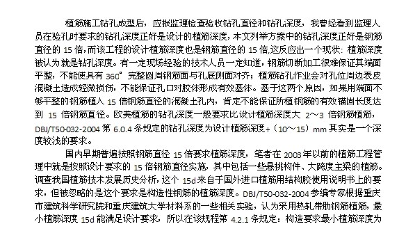 植筋施工鉆孔成型后,應(yīng)報監(jiān)理檢查驗(yàn)收鉆孔直徑和鉆孔深度,在驗(yàn)孔時要求的鉆孔深度正好是設(shè)計(jì)的植筋深度,鉆孔深度正好是鋼筋直徑的15倍,而該工程的設(shè)計(jì)植筋深度也是鋼筋直徑的15倍,這反應(yīng)出一個現(xiàn)狀:植筋深度被認(rèn)為就是鉆孔深度。有一定現(xiàn)場經(jīng)驗(yàn)的技術(shù)人員一定知道,鋼筋切斷加工很難保證其端面平整,不能使具有360°完整圓周鋼筋面與孔底側(cè)面對齊;植筋鉆孔作業(yè)會對孔位周邊表皮混凝土造成輕微損傷,不能保證孔口對膠體形成有效基體;谶@兩個原因,如果用端面不夠平整的鋼筋植入15倍鋼筋直徑的混凝土孔內(nèi),肯定不能保證所植鋼筋的有效錨固長度達(dá)到15倍鋼筋直徑。歐美植筋的鉆孔深度一般要求比設(shè)計(jì)植筋深度大2~3倍鋼筋植筋,DBJ/T50-032-2004第6.0.4條規(guī)定的鉆孔深度為設(shè)計(jì)植筋深度+(10~15)mm其實(shí)是一個深度較淺的要求。