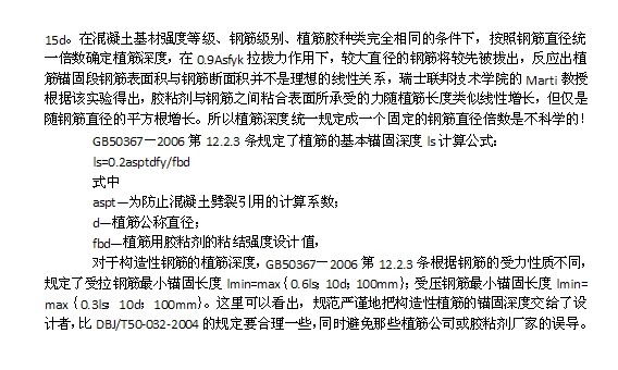 對于Ⅰ級鋼能否用于“植筋”,目前業(yè)界爭議較大。JGJ145-2004和GB50367-2006規(guī)定不使用光圓鋼筋,原因在于光圓鋼筋不能形成機(jī)械牙鍵,所植鋼筋長期錨固性能不能得到保障。DBJ/T50-032-2004第3.0.1條規(guī)定:混凝土植筋技術(shù)不適用于各種輕質(zhì)混凝土結(jié)構(gòu)、砌體結(jié)構(gòu)以及采用圓鋼作為植入鋼筋的承重結(jié)構(gòu),對非承重結(jié)構(gòu)的拉接構(gòu)造的植筋施工可參照本規(guī)程執(zhí)行。根據(jù)這個規(guī)定區(qū)分結(jié)構(gòu)構(gòu)件的重要性,框架結(jié)構(gòu)填充墻拉結(jié)筋如果設(shè)計(jì)光圓鋼筋采用植筋方式施工應(yīng)該允許,而運(yùn)用Ⅰ級鋼筋剪力墻豎向分布筋植筋錨固則不太恰當(dāng)。應(yīng)該注意的是,地方標(biāo)準(zhǔn)西南05G701系列圖集中的填充墻拉結(jié)筋推薦了三種做法,第一種是預(yù)留拉結(jié)筋法,第二種是預(yù)埋鐵件法,最后一種是才是植筋法。然而在其后頒發(fā)的國家標(biāo)準(zhǔn)06SG614圖集中卻限定使用預(yù)留拉結(jié)筋和預(yù)埋鐵件兩種方法,并不主張采用植筋方式施工填充墻拉結(jié)筋。