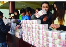 2014年1月15日 四川加固公司 四川涼山州冕寧縣復(fù)興鎮(zhèn)建設(shè)村召開 2013年分紅大會(huì),分紅金額達(dá)1311.5萬元。現(xiàn)場(chǎng),重達(dá)312斤的人民幣現(xiàn)金一捆捆整齊地放在臺(tái)上,340余戶入股村民排隊(duì)領(lǐng)錢,最多的一戶領(lǐng)到了30萬元,最少的也有近萬元,數(shù)錢數(shù)到手都軟了。村上分紅金額最多的,是村民金鷗,他領(lǐng)到了30萬元!疤炖洌瑪(shù)了半天,手都數(shù)軟了,都還沒有數(shù)清楚!卑彦X放進(jìn)袋子里,金鷗甩著手說。