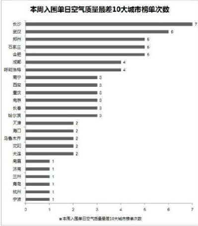 2014年3月10日北京人民網(wǎng)環(huán)保頻道每日發(fā)布各直轄市、省會(huì)城市及計(jì)劃單列市空氣質(zhì)量最差10個(gè)城市排行榜已有一周時(shí)間,現(xiàn)根據(jù)一周以來的各大城市空氣質(zhì)量指數(shù)加權(quán)平均進(jìn)行排行,本周空氣質(zhì)量最差10個(gè)城市為:長(zhǎng)沙、石家莊、長(zhǎng)春、鄭州、哈爾濱、呼和浩特、合肥、武漢、成都、重慶。在36個(gè)直轄市、省會(huì)城市及計(jì)劃單列市中,長(zhǎng)沙連續(xù)7天上榜空氣質(zhì)量最差10大城市,武漢連續(xù)6天上榜,其次合肥、石家莊、鄭州均是5天上榜。